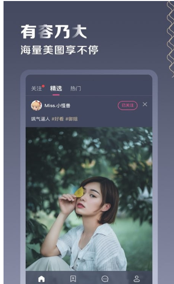 作为一款融合了美图欣赏、社交互动和个性化定制的多功能安卓应用,“有容乃大”不仅为用户呈献海量高清图像资源,还提供便捷的图片和短视频设置为手机背景的功能,使界面展现更具个人特色。此外,软件内建的丰富社交模块让用户可以通过实名认证结识志趣相投的好友,一同分享生活点滴,拓宽社交网络。
